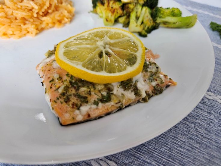 Once the salmon has been brushed with the seasoning paste top with lemon slices. Wala it’s ready for the oven. When cooking it can cause a liquid to bubble out and turn white. This is normal and does not mean that the salmon is not good, or not cooked all the way. This is some of the liquid proteins called Albumin coming out, and they turn white when exposed to heat.